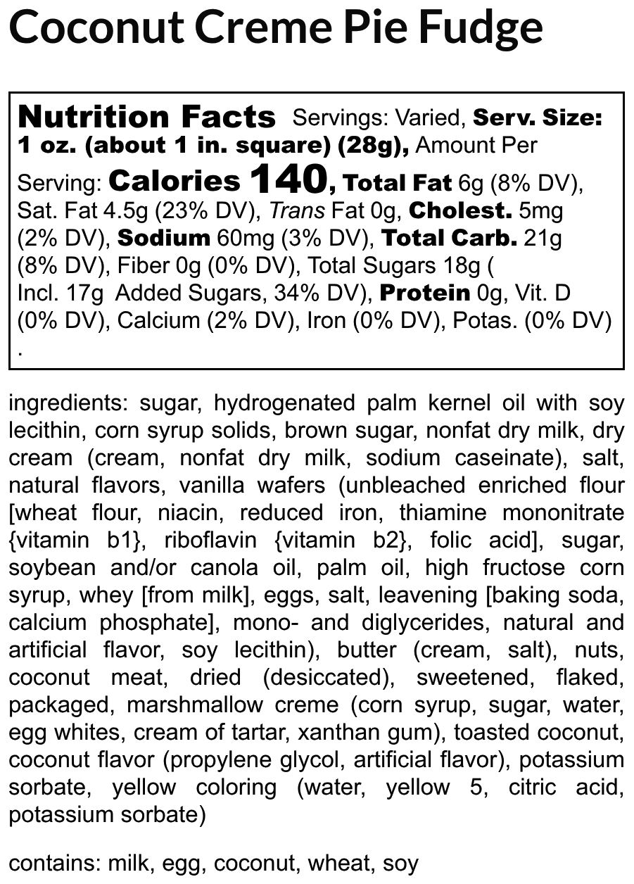 All of our fudge may contain trace amounts of nuts, milk proteins, egg, gluten and peanuts that are used at our facility.