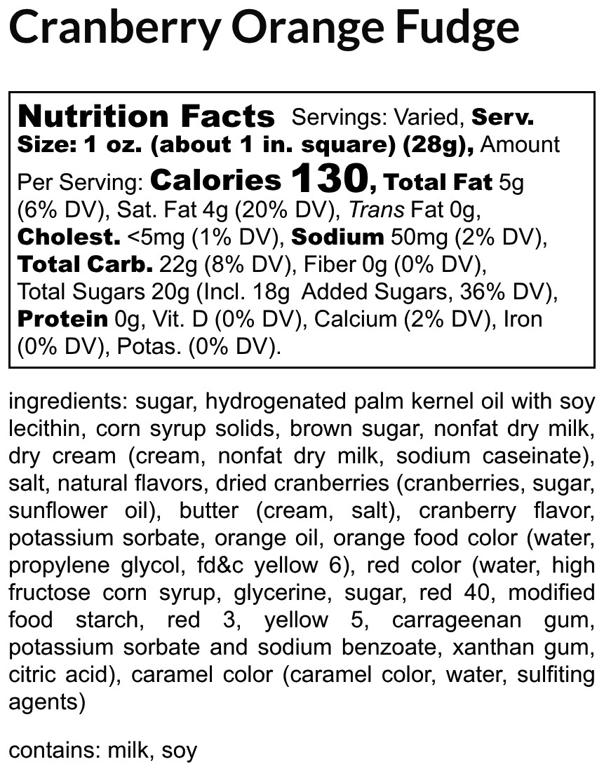 All of our fudge may contain trace amounts of nuts, milk proteins, egg, gluten and peanuts that are used at our facility.