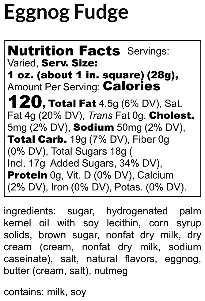 All of our fudge may contain trace amounts of nuts, milk proteins, egg, gluten and peanuts that are used at our facility.