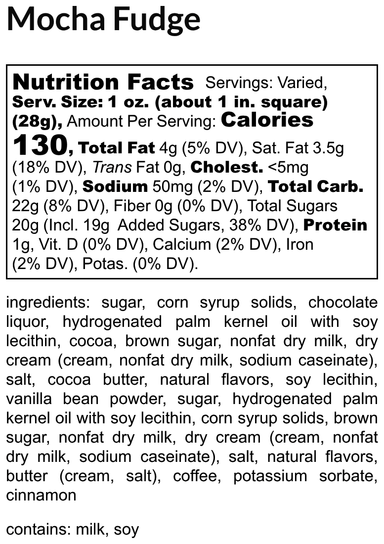 All of our fudge may contain trace amounts of nuts, milk proteins, gluten and peanuts that are used at our facility.